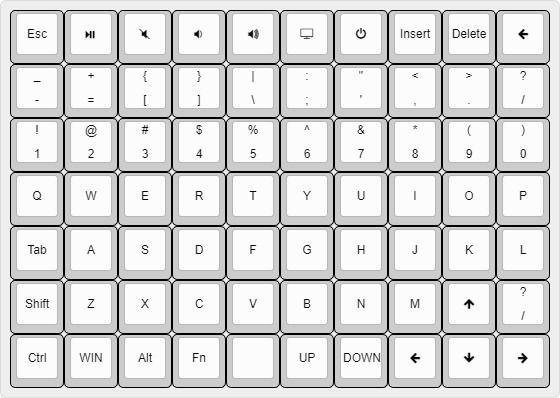 [ # Layer 0 QWERTY 'ESC', 'MUTE', 'VOLD', 'VOLU', 'MNXT', 'MPRV','GRV','INS','DEL','BSPC', 'MINS', 'EQL', 'LBRC', 'RBRC', 'BSLS', 'SCLN','QUOT', 'COMM', 'DOT', 'SLSH', 'N1', 'N2', 'N3', 'N4', 'N5', 'N6', 'N7', 'N8', 'N9', 'N0', 'Q', 'W', 'E', 'R', 'T', 'Y', 'U', 'I', 'O', 'P', 'TAB', 'A', 'S', 'D', 'F', 'G', 'H', 'J', 'K', 'L', 'LSFT', 'Z', 'X', 'C', 'V', 'B', 'N', 'M', 'UP', 'ENT', 'LCTL', 'LGUI', 'LALT', MOLYR, 'SPC', 'PGUP', 'PGDN','LEFT', 'DOWN', 'RGHT', ]